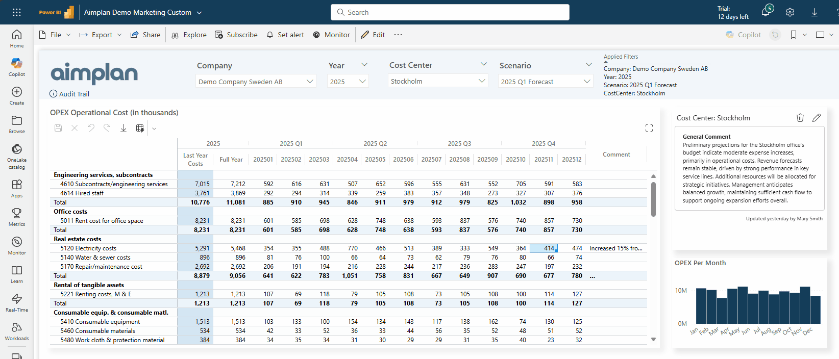 Aimplan works inside Power BI, not beside it. All plan and actual data stay in one model with full visibility. Finance, sales, and operations can plan, forecast, and report together on one shared source of truth.