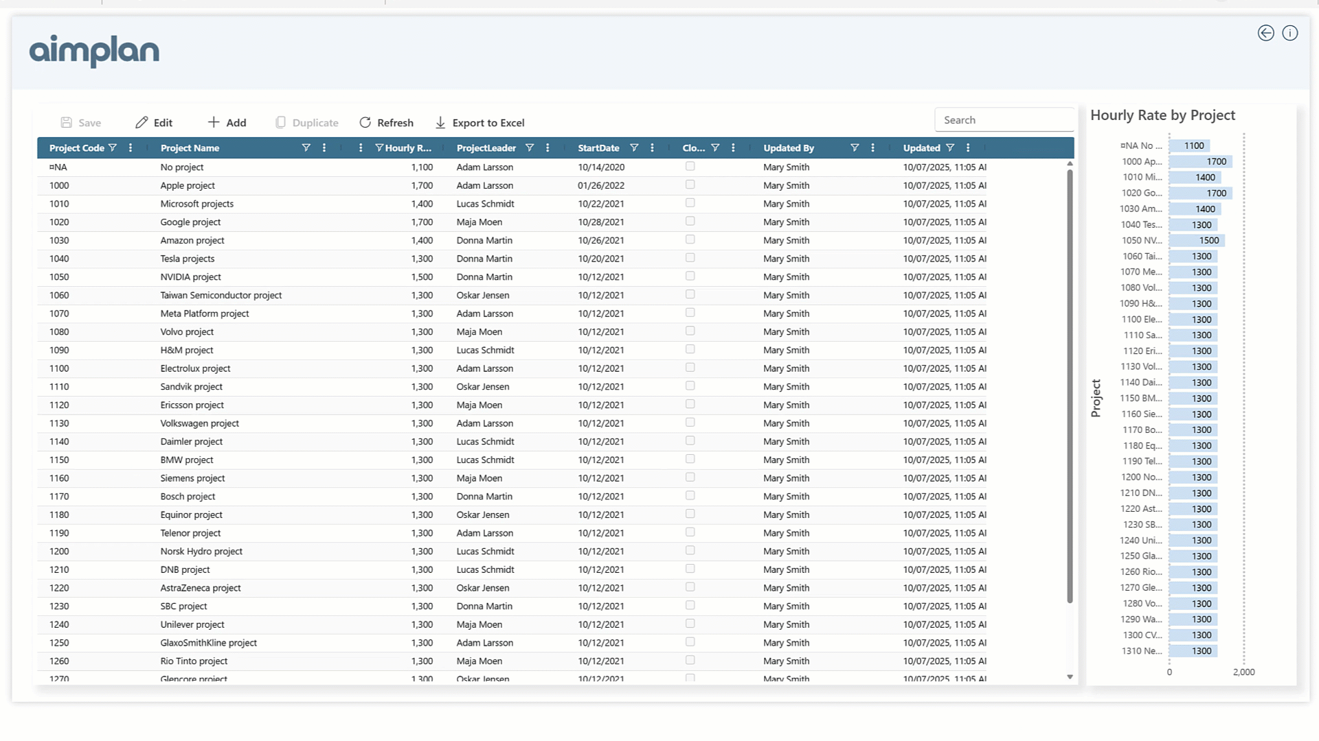 Aimplan turns project reporting from a reactive process into a proactive one. Instead of reviewing results after the fact, managers use live data in Power BI to guide ongoing projects. Forecasts can be refined continuously, allowing teams to anticipate risks, rebalance resources, and make timely course corrections. This forward-looking approach improves agility and ensures every project stays aligned with its financial targets.